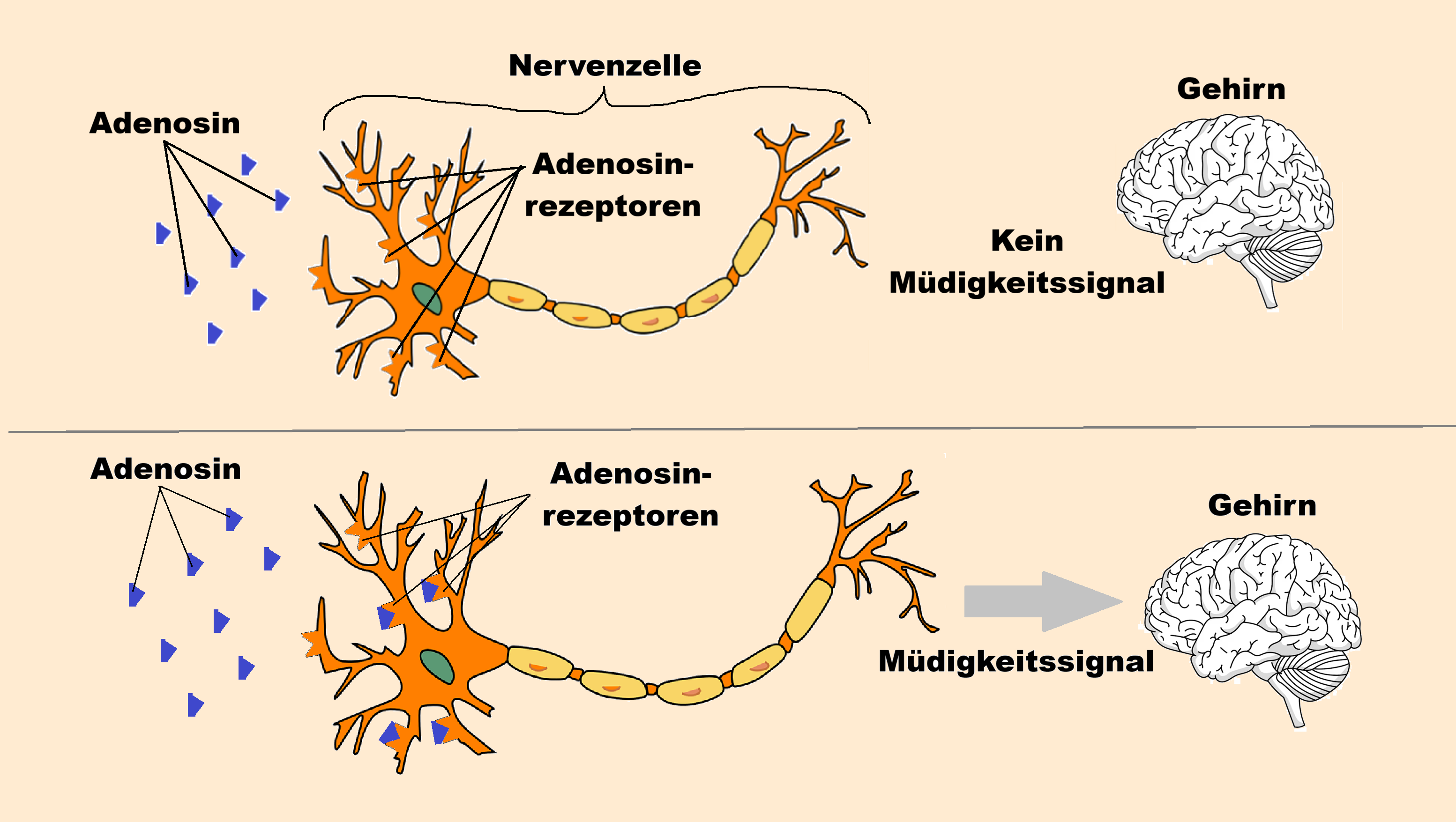 Adenosin entsteht in unserem Körper bei Anstrengung jeglicher Art. Dies ist nötig, um dem Körper zu signalisieren, dass er müde wird. Je mehr Anstrengung, desto mehr Adenosin in unserem Körper.